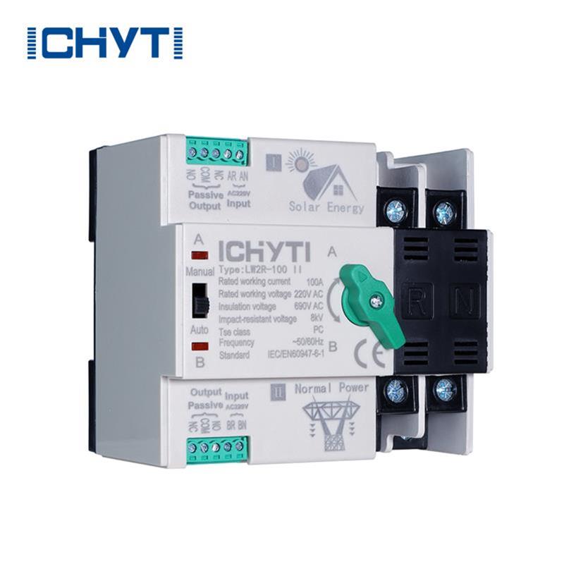 China Factory ICHYTI 100a ats Umschalter Made in China ist ein Gerät, das in Notstromversorgungssystemen verwendet wird und für Nennspannungen von nicht mehr als 1000 V AC oder 1500 V DC geeignet ist. Seine Hauptfunktion besteht darin, die Stromversorgung der Last während des Stromumwandlungsprozesses zu unterbrechen.