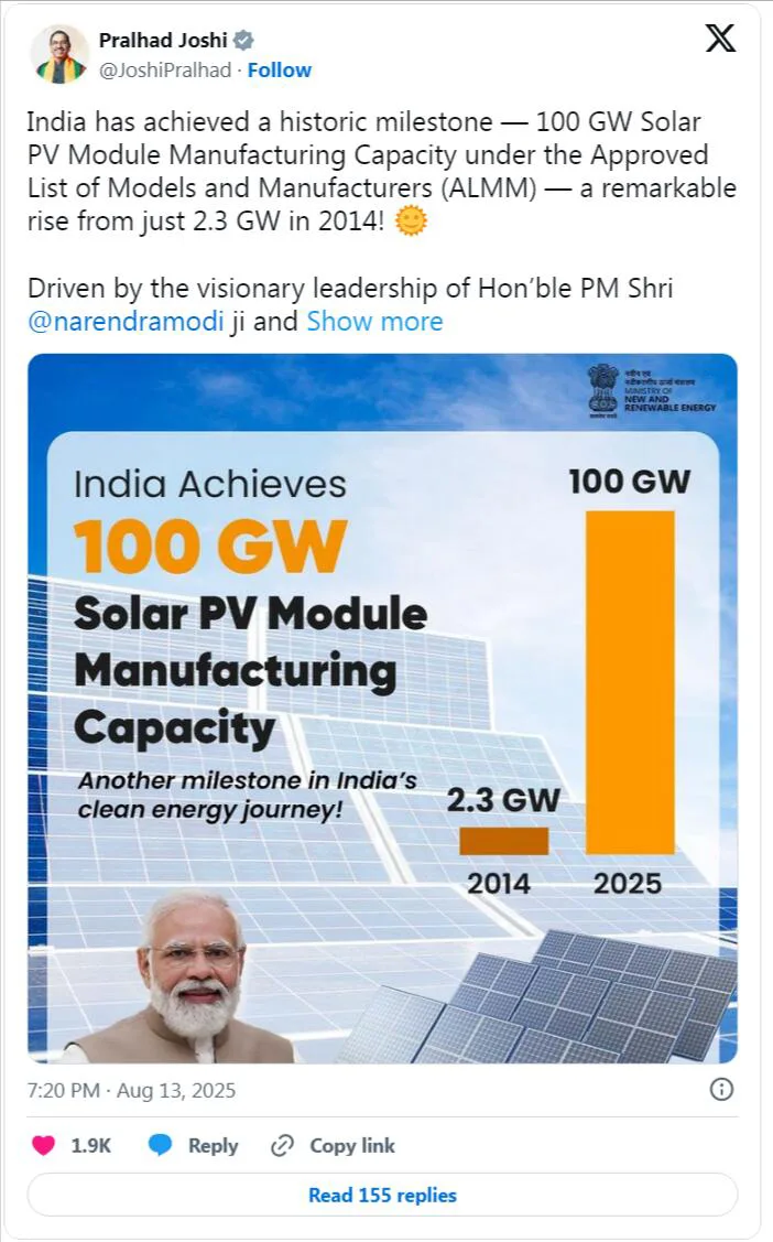 Anfang dieses Jahres, im Februar 2025, erreichte Indien einen Meilenstein von 100 Gigawatt installierter Solar-Photovoltaik-Kapazität, eine Steigerung von 3450 % gegenüber 2,8 Gigawatt im Jahr 2014.